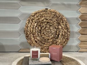 Vela de cera 100% vegetal con aroma y recipiente de vidrio transparente con tapa de madera. Los olores de las velas son: Smoky Woods, Orquídea y Ámbar, Esencia de Aura y Gingerbread Recogida tienda