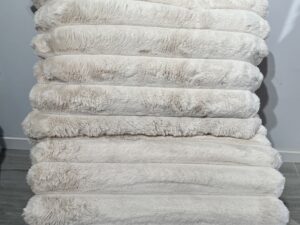 Manta 100% poliéster de tacto suave, de estilo sherpa una cara de borreguito cálido y la otra de pelo suave. Medida 130×170 cm, color único. Ideal para aportar confort y calidez.